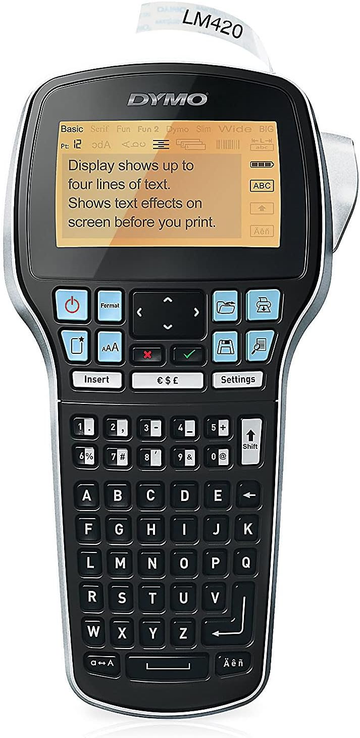 The DYMO LabelManager 420P is a high-performance handheld label maker designed for both professional and everyday organizational tasks. It features a large backlit display that shows up to four lines of text, making it easy to preview and edit labels before printing.